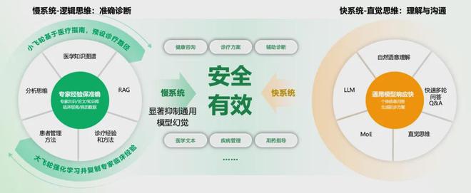 一是模拟人脑认知逻辑的三层架构,即“快系统(类比大脑皮层执行语义任务)+慢系统(类比前额叶深度推理)+ACC层(类比前扣带皮层,调和快慢系统矛盾)”,三层架构形成强耦合闭环,少一层即退化为普通模型。其中,快系统调用通用模型,快速响应用户需求,负责理解与沟通;慢系统基于专家经验,可显著抑制通用模型的“幻觉”,负责准确诊断。慢系统还集成了双飞轮结构,小飞轮基于临床指南预设诊疗路径,大飞轮强化学习并复制专家临床经验,双飞轮协调联动,构建起可持续优化的完整闭环。