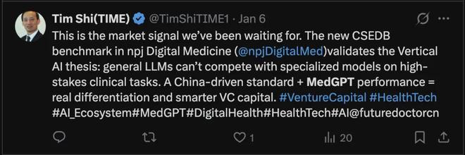 全球医生组织中国总代表、GlobalMD创始人Tim Shi(时占祥)近日也在海外社交媒体上为此点赞:由中国推动的标准+MedGPT的表现=真正的差异化以及更聪明的风投资产。