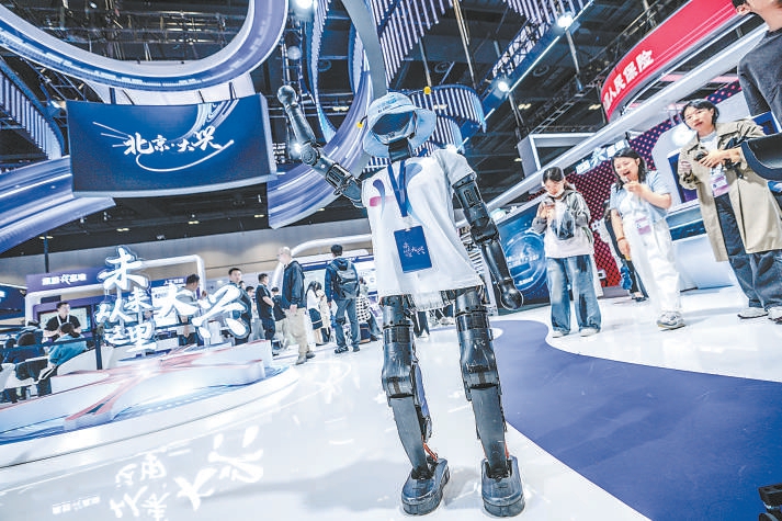 昨天,在北京科博会大兴展区,一台人形机器人在与参观者互动。 本报记者 武亦彬 摄