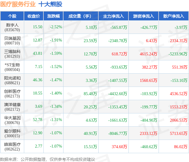 个股表现方面,医疗服务行业当日领跌股为数字人(835670),该股当日报收15.5,下跌2.52%,成交量5.1万,主力资金净流出565.87万元。贝瑞基因(000710)以下跌1.91%紧随其后,该股当日成交量23.59万,主力资金净流出2340.78万元。除此之外,三博脑科(301293)、*ST生物(000504)、阳光诺和(688621)均进入当日熊股之列。具体个股列表见下表: