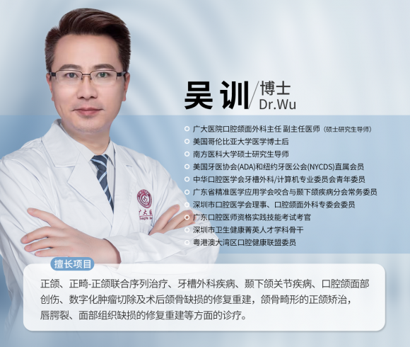 吴训,博士,副主任医PG电子官网师,广州广大医院口腔颌面外科主任,同时担任南方医科大学硕士研究生导师,美国哥伦比亚大学医学博士后。在正颌外科领域,吴训博士展现出了卓越的技术实力与学术造诣,其研究成果多次发表于学术期刊,在行业内具有深远影响力。
