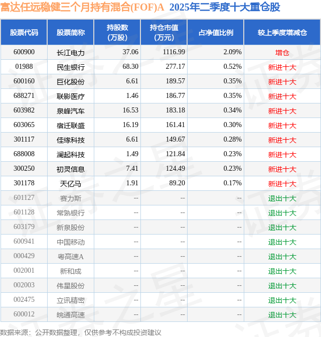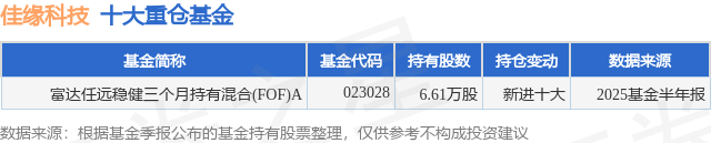 根据2025基金半年报公募基金重仓股数据,重仓该股的公募基金共1家,其中持有数量最多的公募基金为富达基金(中国)的富达任远稳健三个月持有混合(FOF)A。富达任远稳健三个月持有混合(FOF)A目前规模为1.47亿元,最新净值1.0082(8月1日),较上一交易日下跌0.15%。该公募基金现任基金经理为赵强。