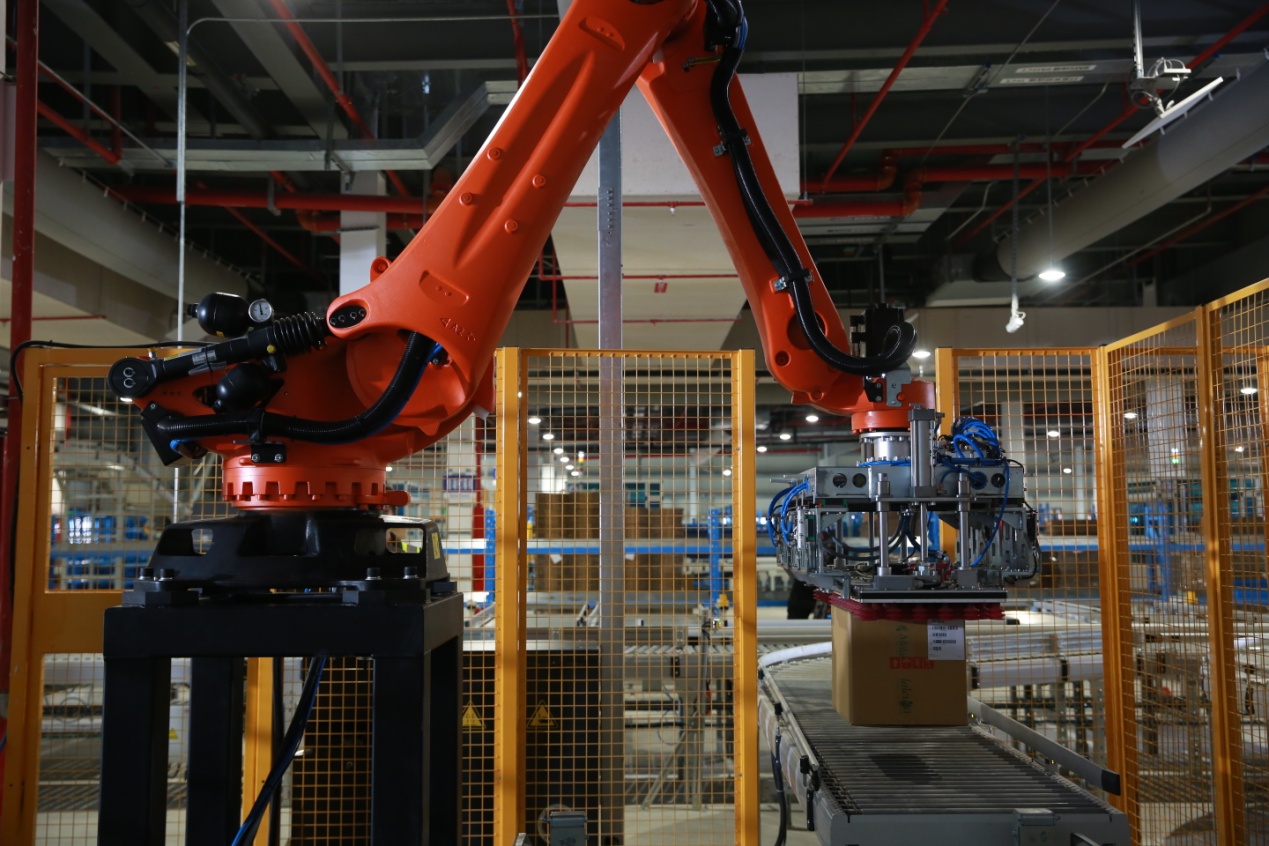 图为美乐家智能仓储物流中心的机器手极大提高了运行效率以及解决复杂订单需求。