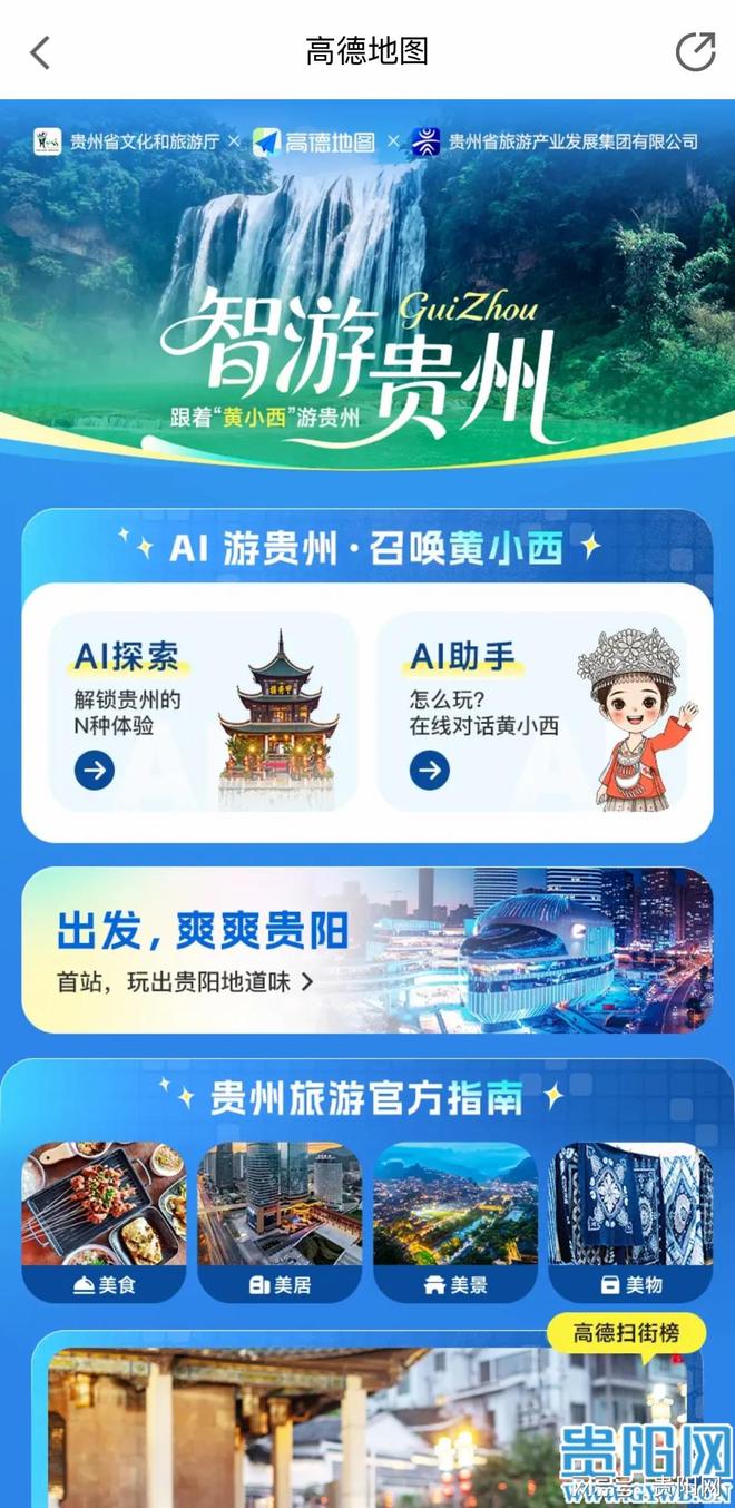 今年2月,贵州文旅与高德达成战略合作,联手打造“黄小西带您游贵州”一键智慧游门户,搭建覆盖“吃、住、行、游、购、娱”的一站式智慧文旅服务平台。该门户依托贵州省旅游数智互联平台10万余项本地文旅数据,结合高德精准定位与出行技术,实现AI伴游个性化、沉浸式升级,可按需定制行程、提供语音导览。游客在高德APP搜索“贵州”“黄果树瀑布”等关键词,即可一键进入服务门户,操作便捷高效。