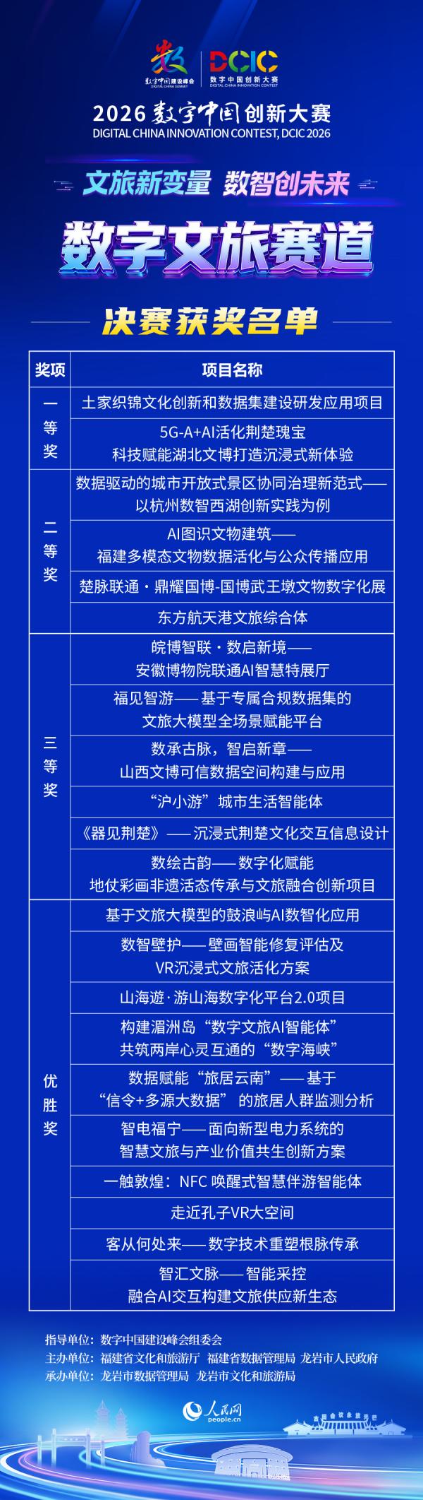 本届数字文旅赛道由数字中国建设峰会组委会指导,福建省文化和旅游厅、福建省数据管理局、龙岩市人民政府主办,龙岩市数据管理局、龙岩市文化和旅游局承办。