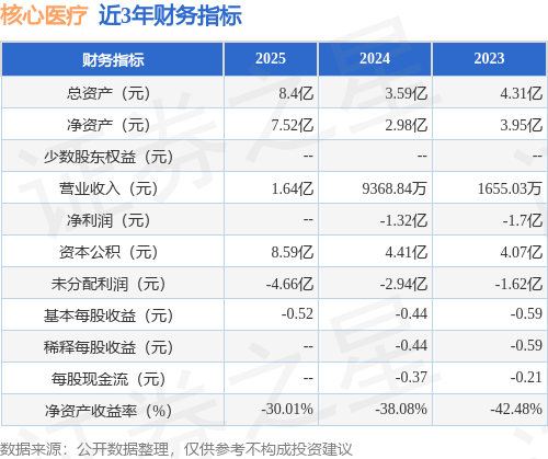 从目前公布的财报来看,核心医疗2025年总资产为8.4亿元,净资产为7.52亿元;近3年净利润分别为nan元(2025年),-1.32亿元(2024年),-1.7亿元(2023年)。详情见下表: